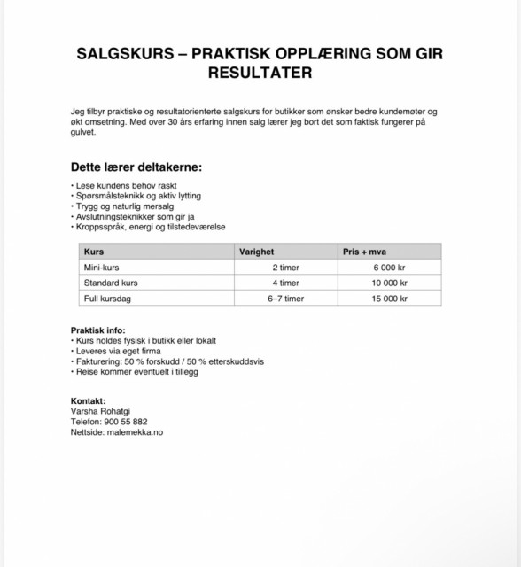 Jeg tilbyr praktiske salgskurs og opplæring for butikker som vil: